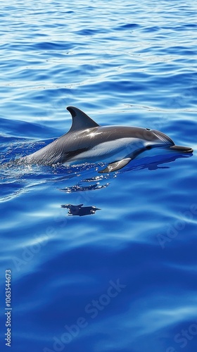 A dolphin swimming gracefully in clear blue ocean waters.