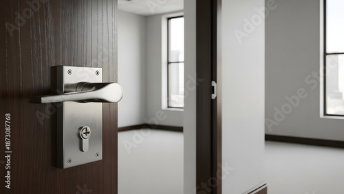 A door with a silver handle and lock is slightly ajar in a modern room with white walls and a window