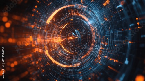 A D-printed futuristic technology symbol, surrounded by digital holographic lights and cyber aesthetics.