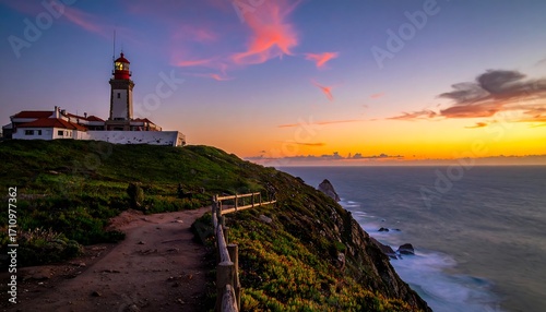 A dramatic coastal landscape at sunrise, featuring a lighthouse perched atop a verdant cliff overlooking a serene ocean.