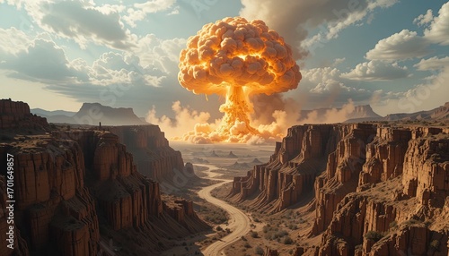 A dramatic explosion centers a vast desert canyon landscape, illuminating the stark beauty of a ravaged terrain.