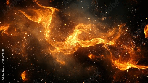 A dramatic fire scene showcasing swirling embers and bright sparks in the darkness.
