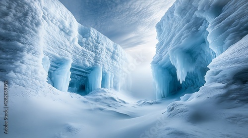 A dramatic glacier scene with massive ice formations, deep crevices, and icy blue tones under a stark winter sky