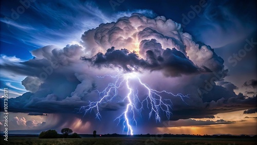 A dramatic lightning bolt illuminates the sky as a powerful storm cloud looms over the horizon, casting a foreboding shadow over the vast green field below.
