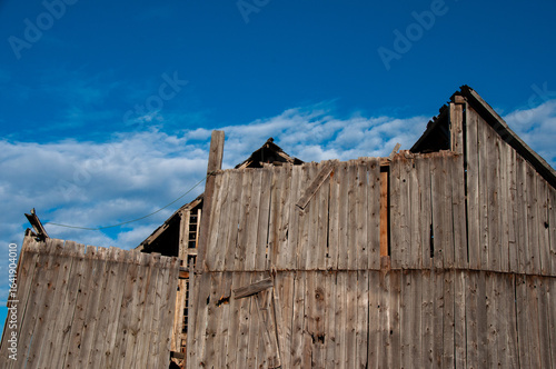A dramatic, low-angle shot of the deteriorating wooden side of an old barn, with its roofline collapsing against a clear blue sky with white clouds.