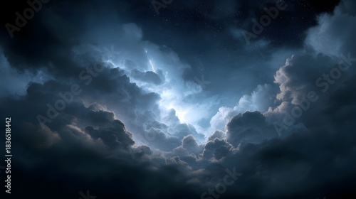 A dramatic night sky features a powerful lightning strike piercing dark turbulent storm clouds showcasing nature s energy and atmospheric intensity