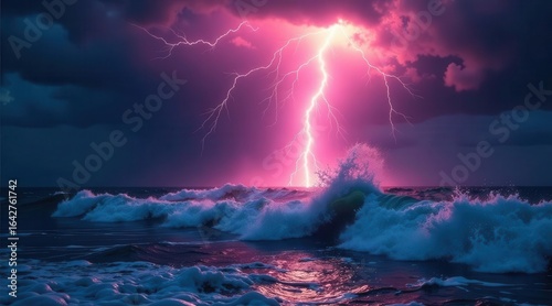 A Dramatic Pink Lightning Strike Over a Turbulent Ocean Scene with Crashing Waves