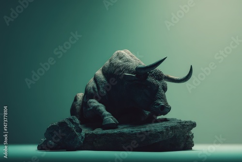 A dramatic, seated bull sculpture, illuminated in muted tones.