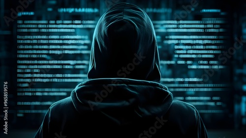 A dramatic shot of a person wearing a hoodie, sitting in front of a computer screen filled with lines of code.