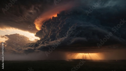 A dramatic sunset behind dark storm clouds