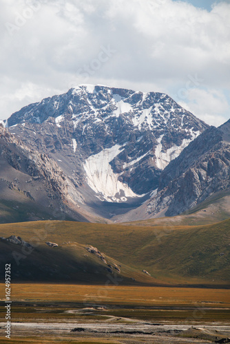 A dramatic vertical shot of a majestic snowcapped mountain peak towering over a vast, golden and green valley under a cloudy sky
