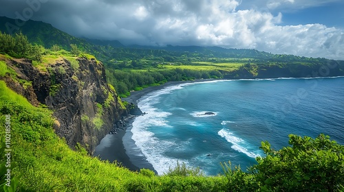 A dramatic view of rugged sea cliffs with black sand beaches below and storm clouds overhead