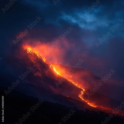 A dramatic, volcanic eruption at night. Nature photography, epic. The only light is the bright, orange glow of lava, powerful and destructive mood. Lava flowing down the side of.