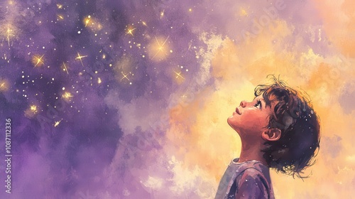 A Dreamy Watercolor Depiction of a Child Gazing Upwards at a Starry Night Sky Full of Twinkling Stars and Vibrant Colors in a Magical Atmosphere