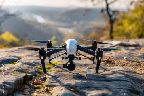 A drone equipped with a camera, ready to capture stunning aerial footage of a river winding through a natural landscape. Generative AI