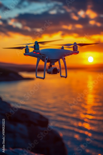 A drone hovers above a tranquil lake as the sun sets, casting warm hues across the sky and reflecting beautifully on the water's surface