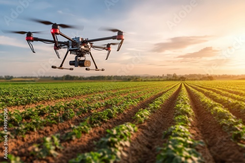 A drone is seen flying over a vast, neatly-planted crop field as the sun sets in the background, illuminating the sky and highlighting the green plants.