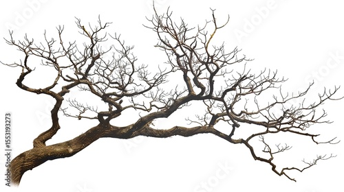 A dry tree branch, stark and isolated against a pure white background. This simple yet evocative image can be used in various nature - themed projects, such as environmental awareness campaigns,