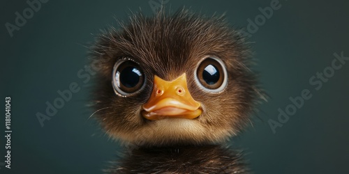 A duckling with large eyes featuring soft, dark brown feathers. This big eyed creature has a fuzzy exterior in a rich, dark brown color.