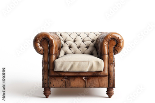 A duo-tone Chesterfield chair with contrasting leather and fabric upholstery, adding visual interest and texture, isolated on solid white background.