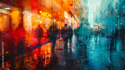 A dynamic abstract composition of layered textures and colors suggesting a bustling marketplace.