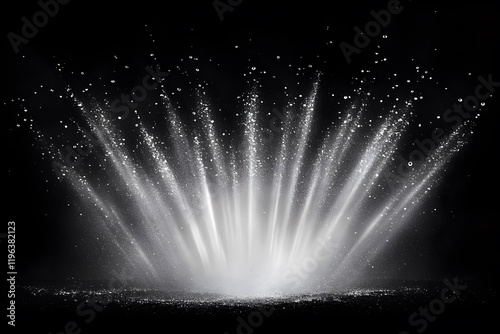 A dynamic composition of fine water droplets captured mid-air against an isolated black background