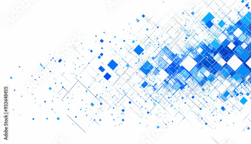 A dynamic digital abstract art composed of overlapping blue and white squares and lines, creating a geometric, futuristic design on a white background.