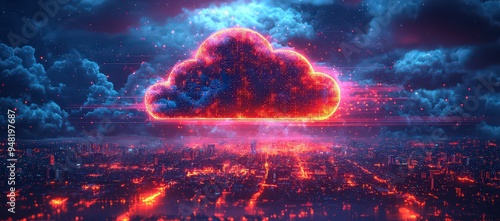 A dynamic holographic cloud icon floating above an urban landscape, with digital lines representing data and technology