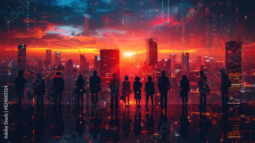 A dynamic movie poster showing a group of diverse business professionals standing united in front of a futuristic cityscape, glowing with opportunity