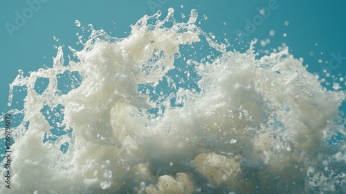 A dynamic splash of water creating foam and bubbles against a blue background.