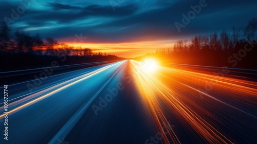 A dynamic sunset scene on a highway, showcasing light trails from moving vehicles.