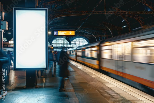 A dynamic urban scene at a train station featuring a moving train and a blurred crowd, highlighting the city's vibrant transport system.