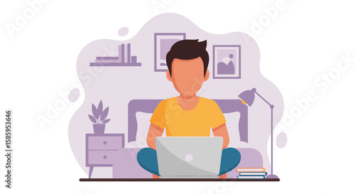A faceless man comfortably works on his laptop while sitting cross-legged on the floor in a cozy bedroom setting, illustrating remote work or study.