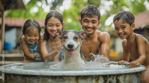 A family gathered around a stray dog in a large tub, smiling as they clean the dog, water splashing playfully, right third copy space. Love and Harmony, Care and Care, Creation