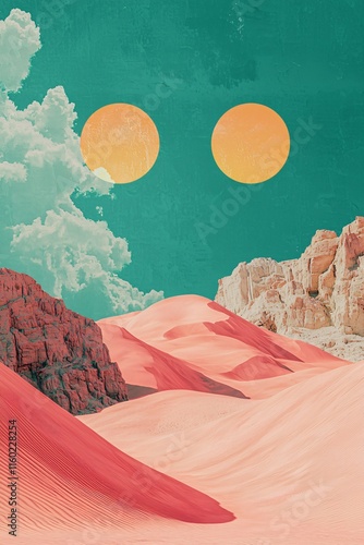 A fantasy desert with neon pink sand dunes under a vivid teal sky filled with two suns.