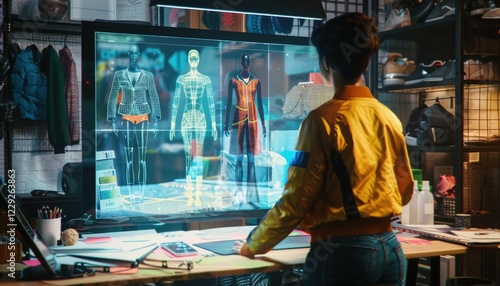 A fashion designer in a chic studio with an AI assistant as a holographic mannequin displaying various outfits, offering real-time design adjustments. AIG60