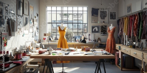 A fashion designer s studio with dress forms, fabric swatches, and sewing equipment, representing the creative process of designing clothing