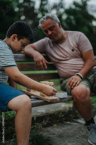 A father and son enjoying a playful moment with building blocks on a bench in a serene park setting.
