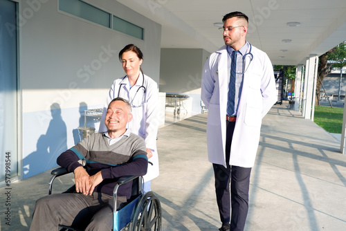 A female doctor and a male doctor take care of an old male patient sitting in a wheelchair.