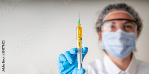 A female laboratory scientist with mask and protective glasses is holding a syringe with COVID-19 Vaccine