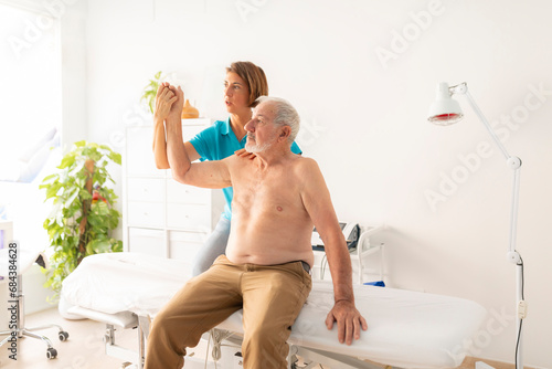 A female physiotherapist performs a massage and checks the mobility of the arm and shoulder of her patient, an older man, who suffers from an ailment or injury