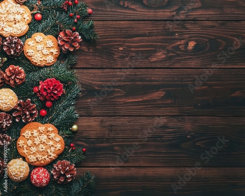 A festive arrangement featuring cookies, pinecones, and greenery against a wooden background, perfect for holiday celebrations.