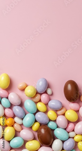A festive arrangement of colorful pastel candies, chocolate eggs, and sweet jelly beans, perfect for celebrating the joyful spring holiday ,confection ,yummy ,jelly bean