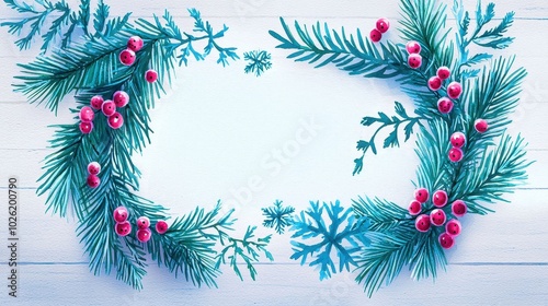 A festive arrangement of pine branches, berries, and snowflakes on a white background, perfect for holiday decor.