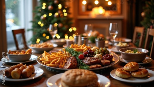 A festive Christmas dinner table features delicious dishes, twinkling lights, and a Christmas tree, creating a warm New Year atmosphere.