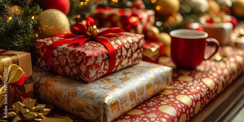 A festive Christmas scene with beautifully wrapped gifts adorned with red and gold ribbons, surrounded by ornaments and a warm cup of drink.