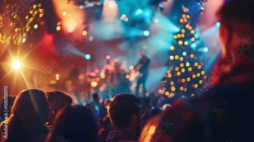 A festive concert scene with a decorated Christmas tree and colorful lights.