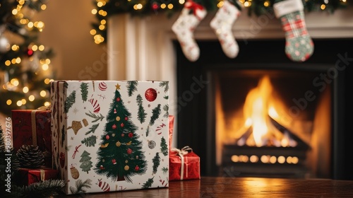 A festive gift box with a Christmas tree design, sitting next to a fireplace with stockings.