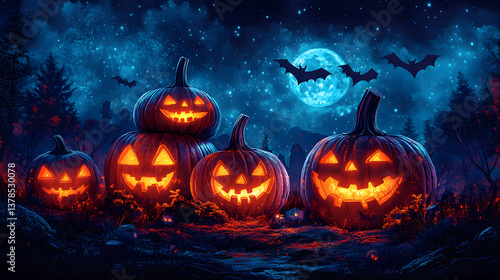 A festive Halloween wall art set with cute pumpkins stacked on each other and tiny bats flying around