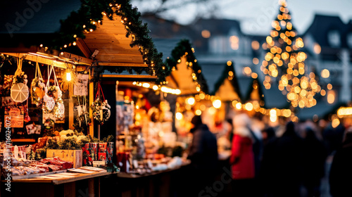 A festive market scene filled with twinkling lights and holiday decorations, showcasing various stalls adorned with seasonal items and treats. atmosphere is warm and inviting, perfect for holiday shop